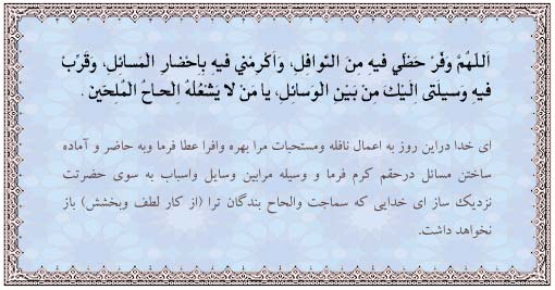 خدايا مقرّر فرما در آنچه حكم می كنى،و تقدير می نمايى از فرمان حتمى،و در آنچه جدا می كنى از كار حكيمانه در شب قدر،و در آن حكم حتمى كه برگشت و تغييرى ندارد،اينكه مرا از حاجيان خانه محترمت بنويسى،حاجيانى كه حجّشان قبول،سعی شان پذيرفته، گناهانشان آمرزيده،بديهايشان ناديده گرفته شده است،و در آنچه حكم میكنى و تقدير می نمايى،مقرّر فرما كه عمرم را طولانى نمايى، و در روزی ام بر من وسعت بخشى،و با من چنين و چنان كنى.